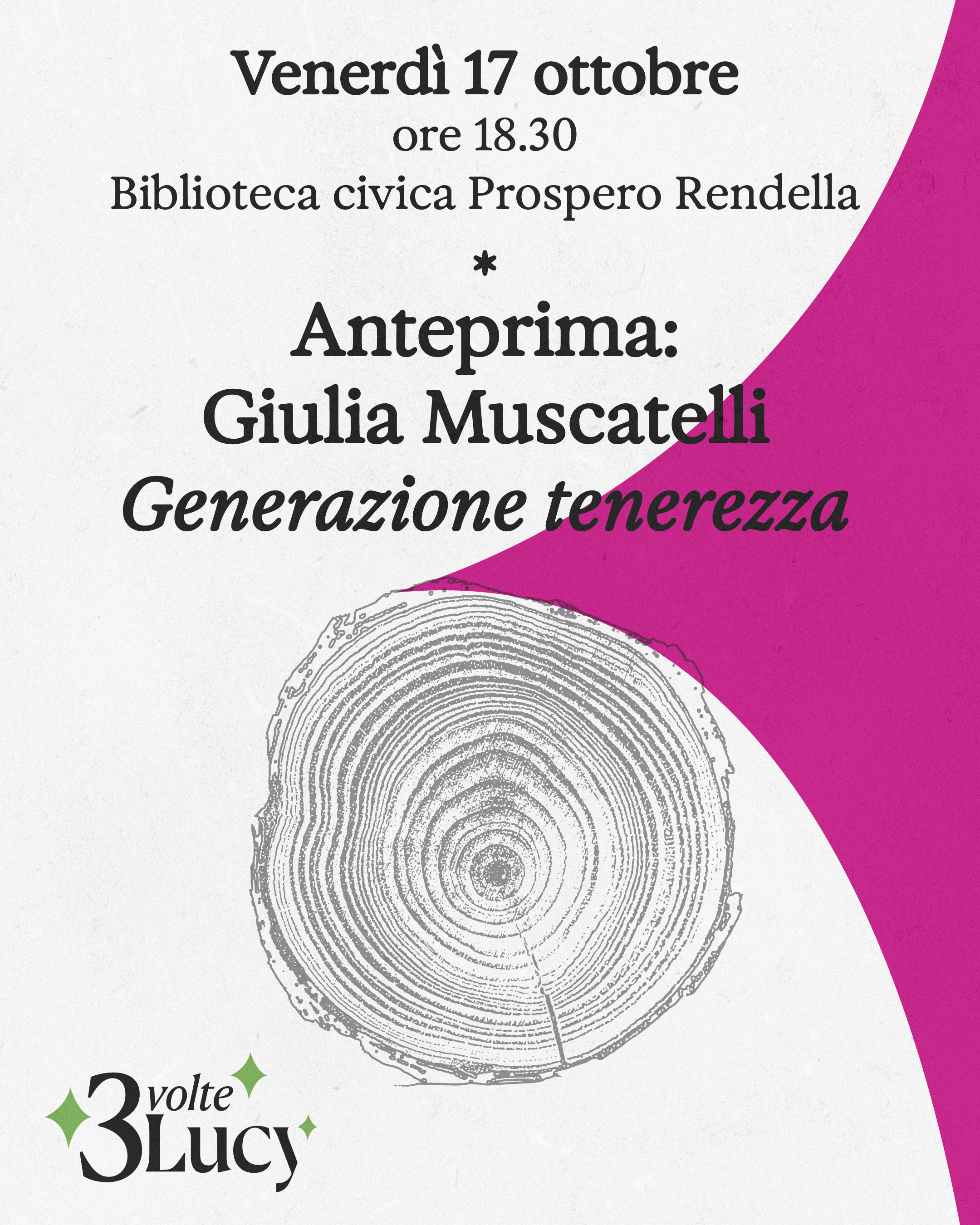 Venerdì 17 ottobre, dalle 18.30 alle 19.30, alla Biblioteca civica Prospero Rendella, in Largo Giuseppe Garibaldi 24, si terrà l’anteprima con Giulia Muscatelli e il suo racconto Generazione tenerezza. Si tratta di una narrazione che parte dall’esplorazione della tenerezza, quell’audace capacità che hanno le persone più giovani (solo loro?) di combinare emozioni e fantasia per affrontare la complessità della vita.