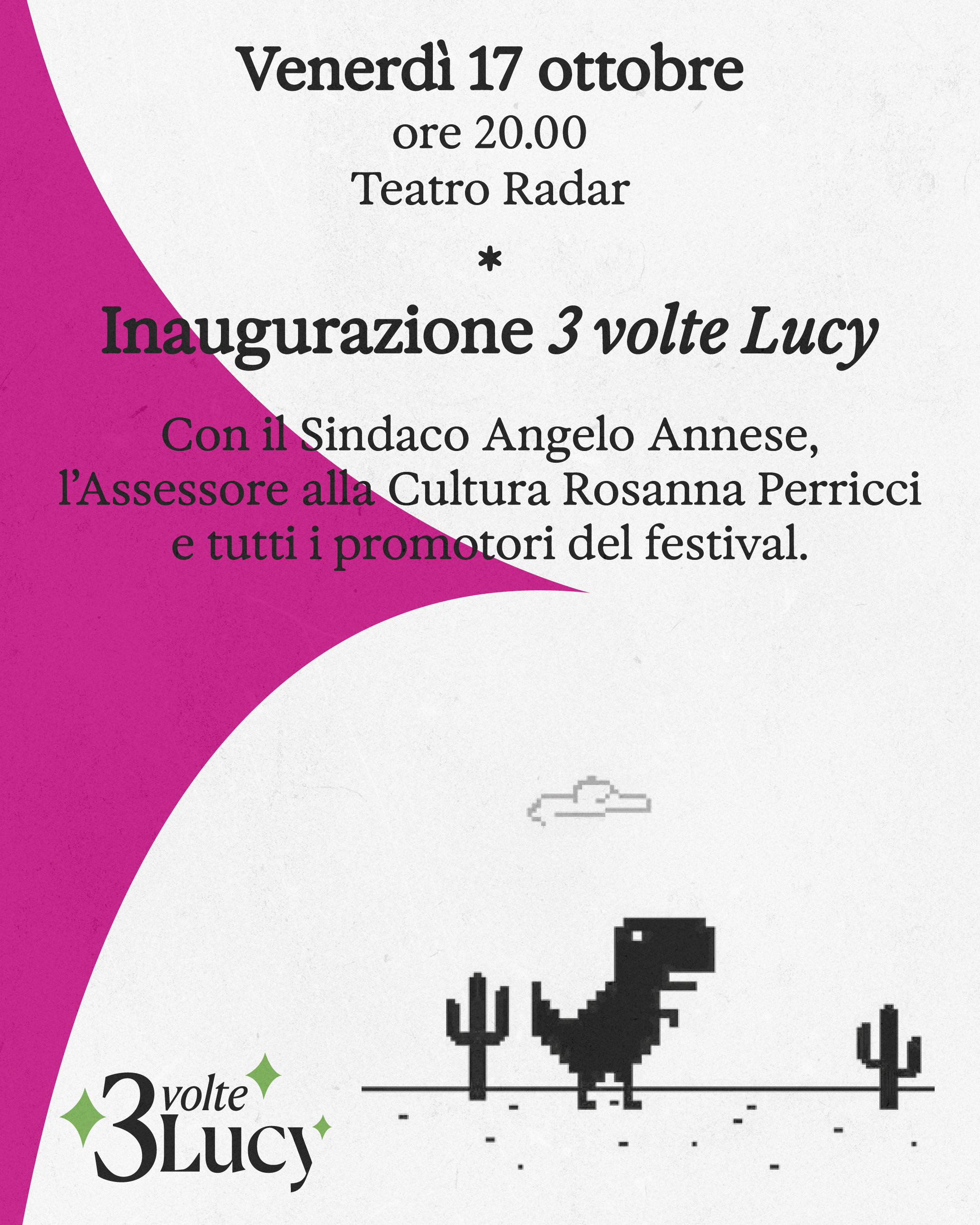 Alle 20.00, al Teatro Radar, in Via Magenta 71/73, ci sarà l’inaugurazione di Tre volte Lucy, alla presenza del Sindaco Angelo Annese, dell’Assessore alla Cultura Rosanna Perricci e di tutti i promotori del festival.