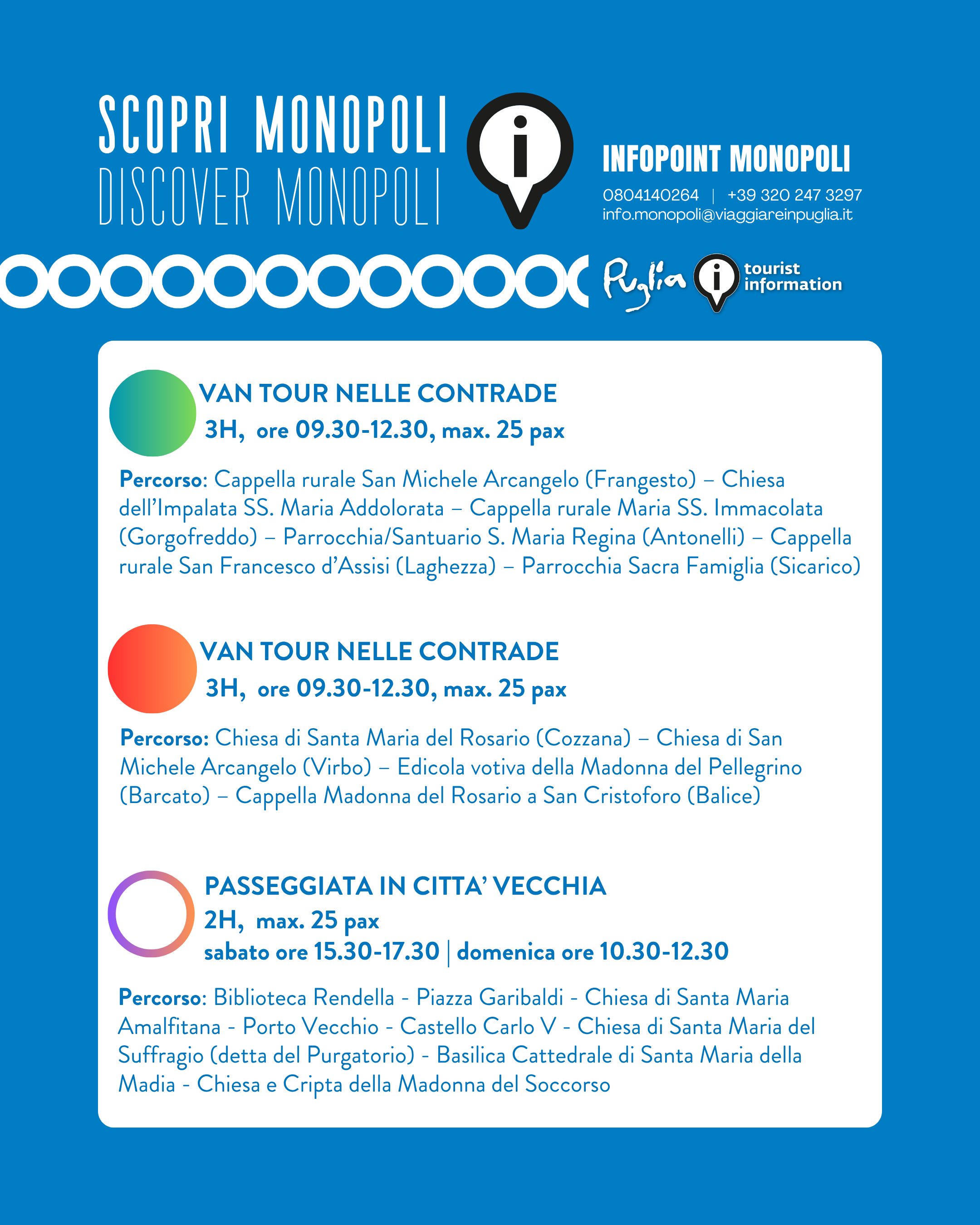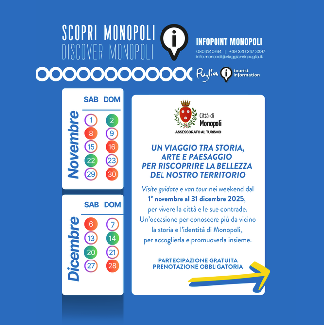 È previsto un calendario di visite guidate e van tour in programma nei fine settimana dal 1° novembre al 31 dicembre 2025, offrendo esperienze di turismo di prossimità e di carattere esperienziale, pensate per far riscoprire la ricchezza culturale di Monopoli anche durante la stagione autunnale e invernale.