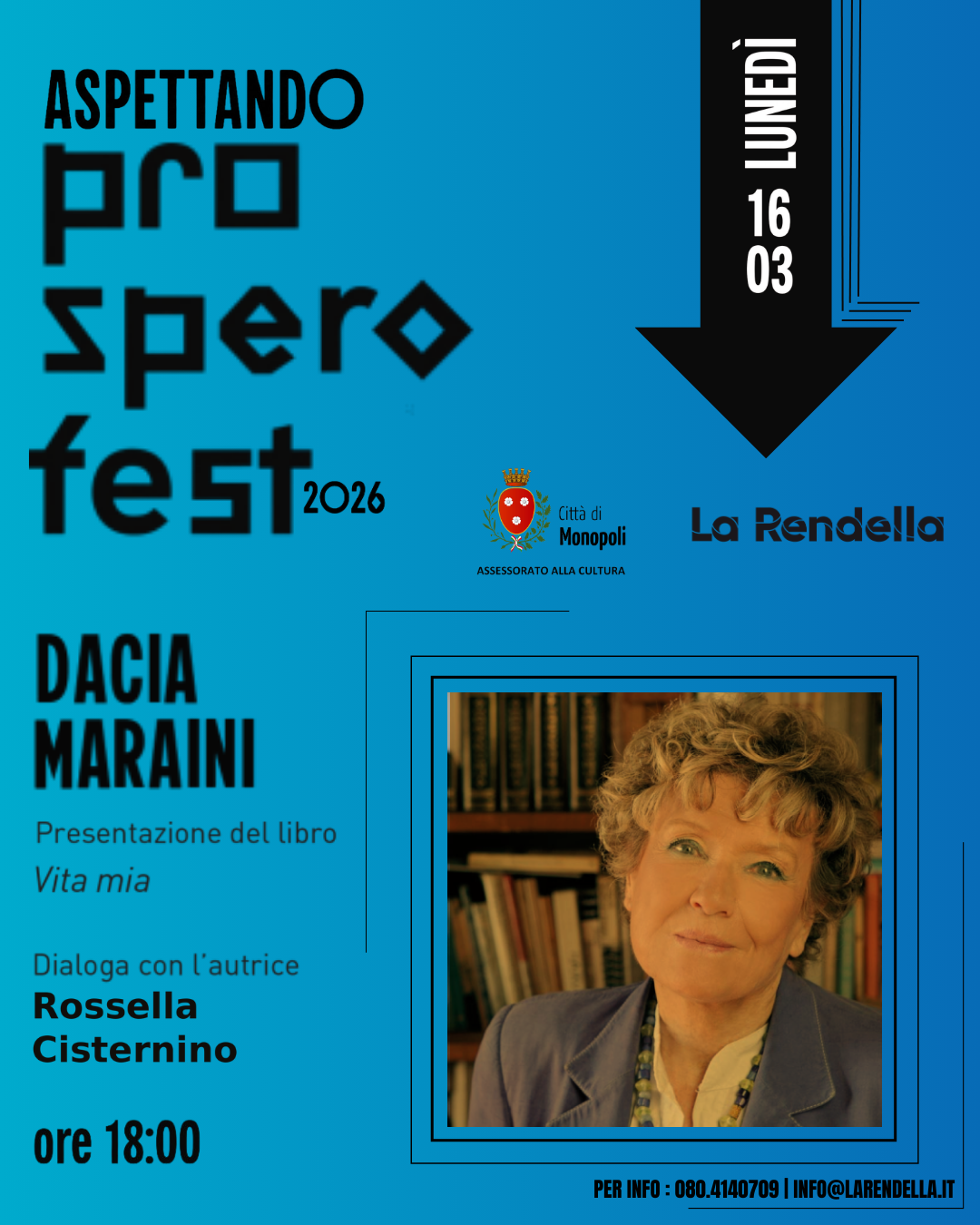 L’Assessore alla Cultura del Comune di Monopoli, Rosanna Perricci, annuncia il ritorno del Prospero Fest 2026. La rassegna, cuore pulsante dell’estate culturale cittadina, tornerà a giugno con la sua ottava edizione ed un programma ricco di ospiti e riflessioni. Quest’anno il sipario si alza in anticipo con Aspettando Prospero Fest 2026, un appuntamento d’eccezione nato come speciale anticipazione della vera e propria rassegna prevista per il prossimo giugno.