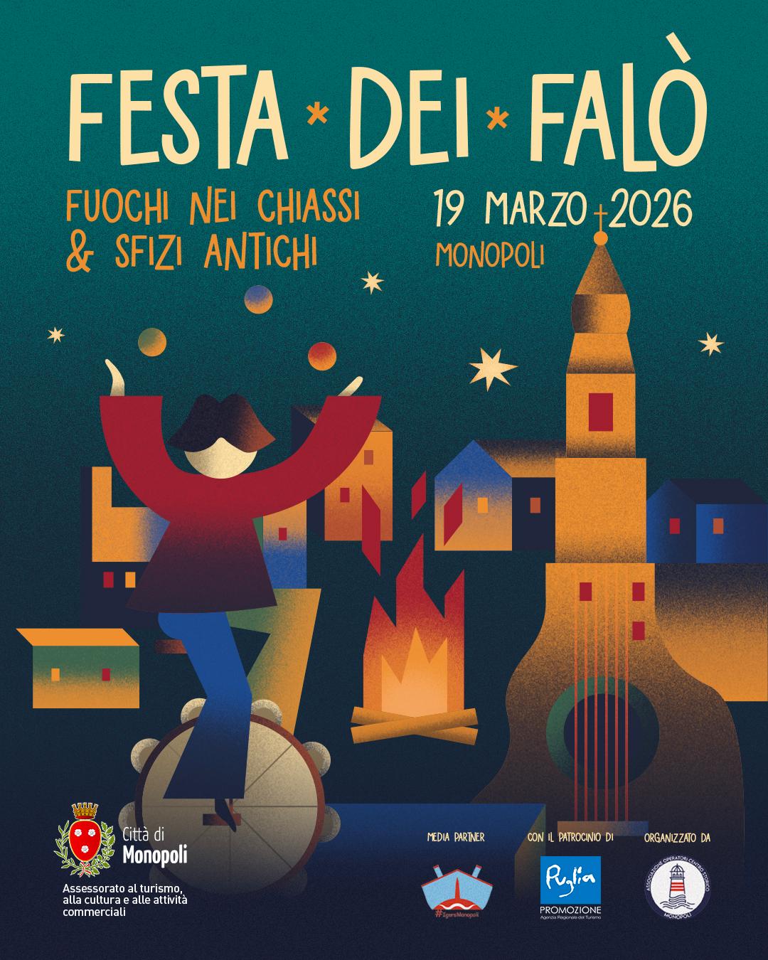 L’edizione 2026 della manifestazione è in programma giovedì 19 marzo 2026 e tornerà ad animare e illuminare il centro storico con i tradizionali falò, tra musica, convivialità e sapori della tradizione. L’evento, organizzato dal Comune di Monopoli – Assessorato al Turismo, alla Cultura e al Commercio, in collaborazione con l’Associazione Operatori Centro Storico e con il patrocinio di Puglia Promozione, si svolge, come da tradizione, in concomitanza con la festa di San Giuseppe, momento simbolico che segna il passaggio verso la bella stagione e rappresenta un auspicio di rinnovamento dopo i mesi invernali.