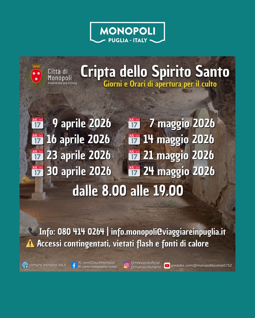 Da Pasqua a Pentecoste, ogni giovedì – 9, 16, 23, 30 aprile e 7, 14, 21 maggio – la Cripta dello Spirito Santo sarà accessibile dalle 8:00 alle 19:00, offrendo ai fedeli e ai visitatori l’opportunità di percorrere un itinerario di devozione e contemplazione. In occasione della Festa della Pentecoste, la cripta aprirà le sue porte anche domenica 24 maggio, negli stessi orari.