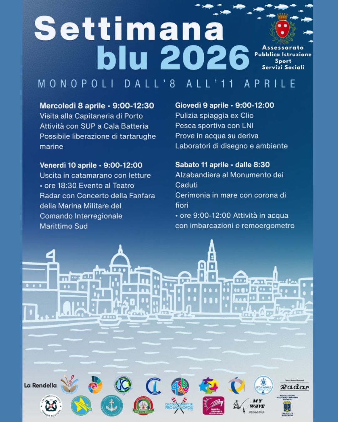 Dall’8 all’11 aprile 2026 Monopoli vivrà quattro giornate interamente dedicate al mare, ai suoi valori e alle nuove generazioni con la “Settimana Blu”, promossa dal Comune attraverso l’Assessorato alla Pubblica Istruzione, l’Assessorato alla Solidarietà Sociale e l’Assessorato allo Sport.